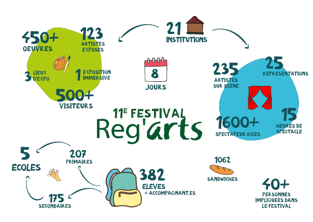 Les matinées ont été entièrement consacrées aux élèves : répartis en 8 petits groupes d’une dizaine, les jeunes ont parcouru des ateliers interactifs (poterie, audio-visuel, boulangerie, land’art…) et les expositions, guidés par des responsables d’équipe, des membres de l’équipe psycho-socio-pédagogique, ainsi que des bénéficiaires de Notre Village. L’après-midi, ils ont assisté à plusieurs spectacles mis en scène par diverses institutions. L’objectif : changer le regard des plus jeunes sur le handicap, favoriser la curiosité et l’empathie. Et vu les retours de nos jeunes visiteurs, c’est réussi!